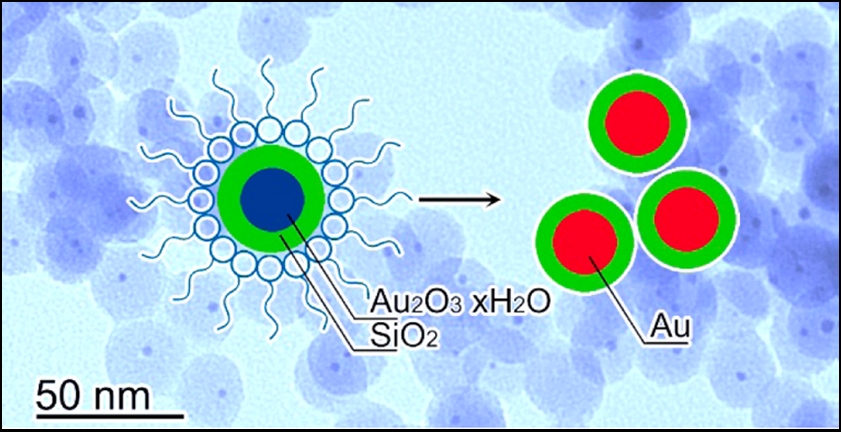粒径小于 3 nm 的金纳米粒子由于尺寸效应而具有优异的催化活性,但是它们极易发生粒子间的团聚或烧结现象从而失去活性,在中高温催化反应中尤为显著。在本论文中,作者提出了一种新颖的思路,借助氢氧化金中间体克服了长期以来小尺寸金属纳米粒子难以包覆金属氧化物的困难,制得了金/二氧化硅核壳结构的纳米材料,从而实现了对小尺寸金纳米粒子的稳定化。该材料表现出优良的高温稳定性及对一氧化碳氧化等反应的催化活性。本文提出的合成策略也对其它金属纳米催化剂的制备提供了新的思路。